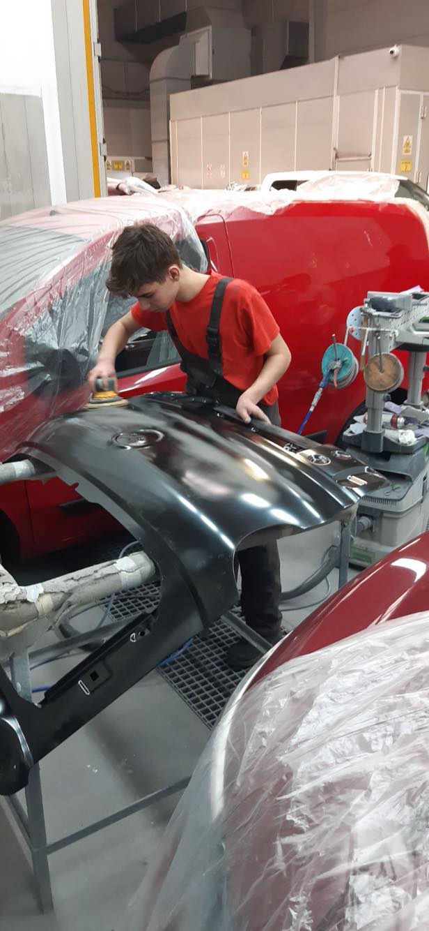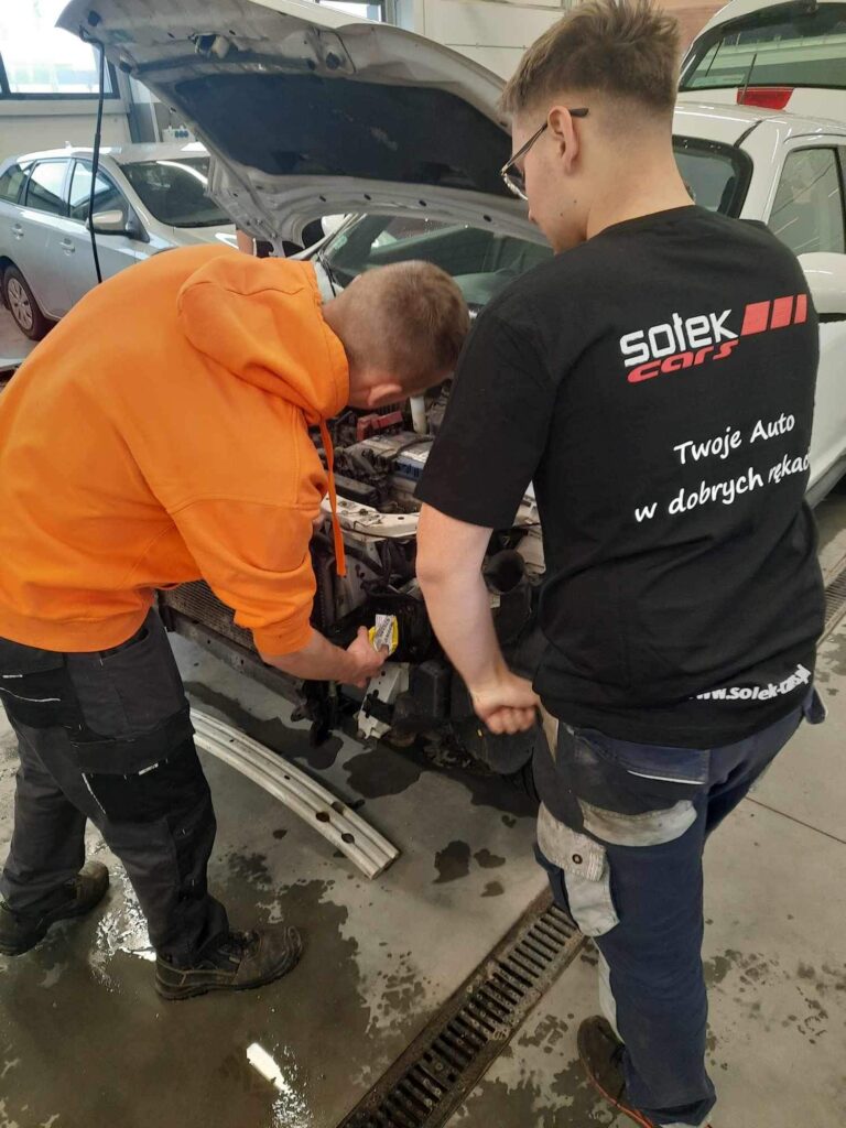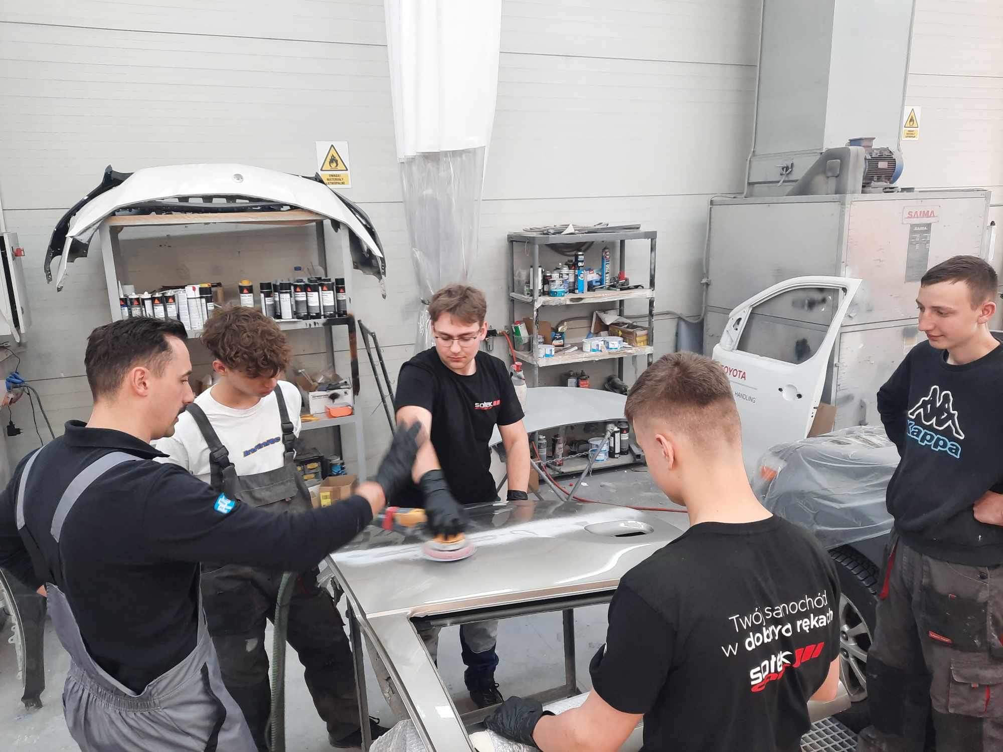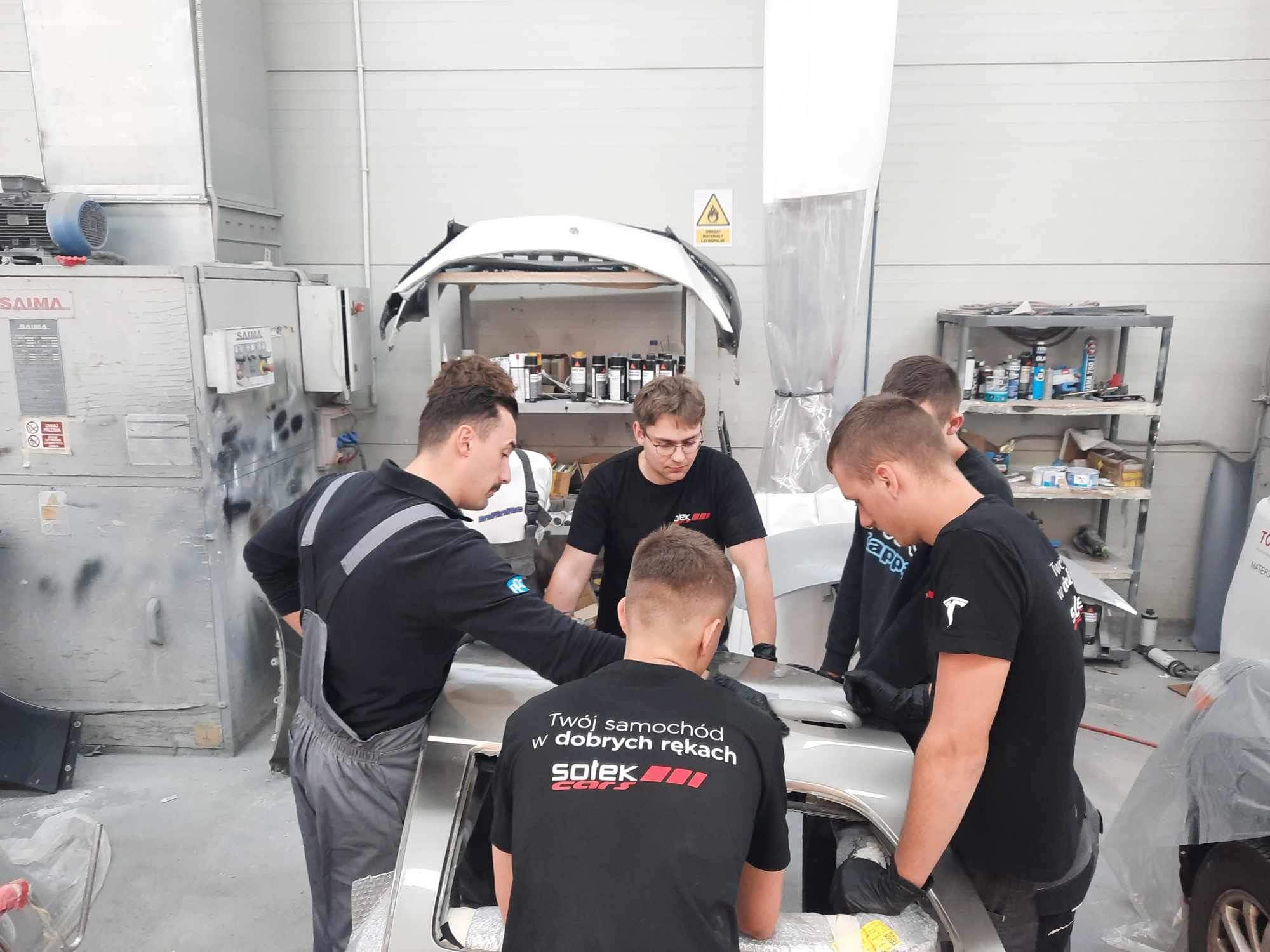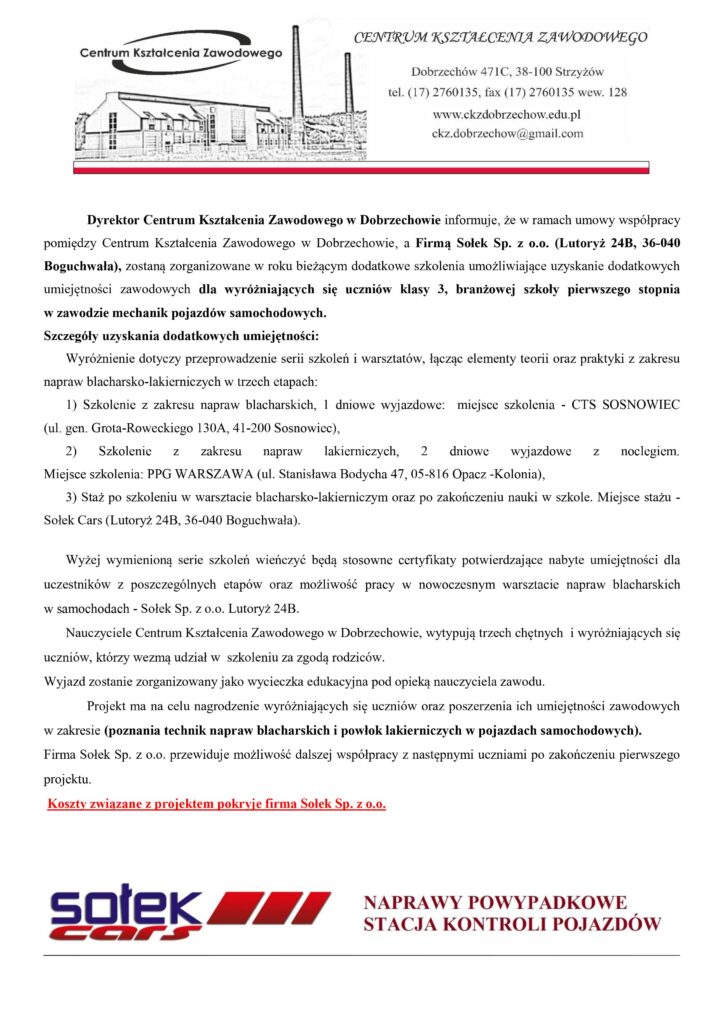 Uczniowie Centrum Kształcenia Zawodowego w Dobrzechowie z klasy 3 – mechanik pojazdów samochodowych odbywają część zajęć praktycznych pod nadzorem nauczyciela zawodu w firmie Sołek CARS w Lutoryżu. Uczniowie Zdobywają doświadczenie w naprawach blacharskich oraz lakierniczych w pojazdach samochodowych.