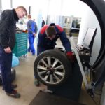 c) Pracownie do kontroli i naprawy pojazdów samochodowych wyposażone w stanowiska z podnośnikami samochodowymi, pojazdy samochodowe nowe i używane do nauki zawodu, montażownicę i wyważarkę kół, myjkę do kół, prasę hydrauliczną, stanowisko do pomiaru emisji spalin,